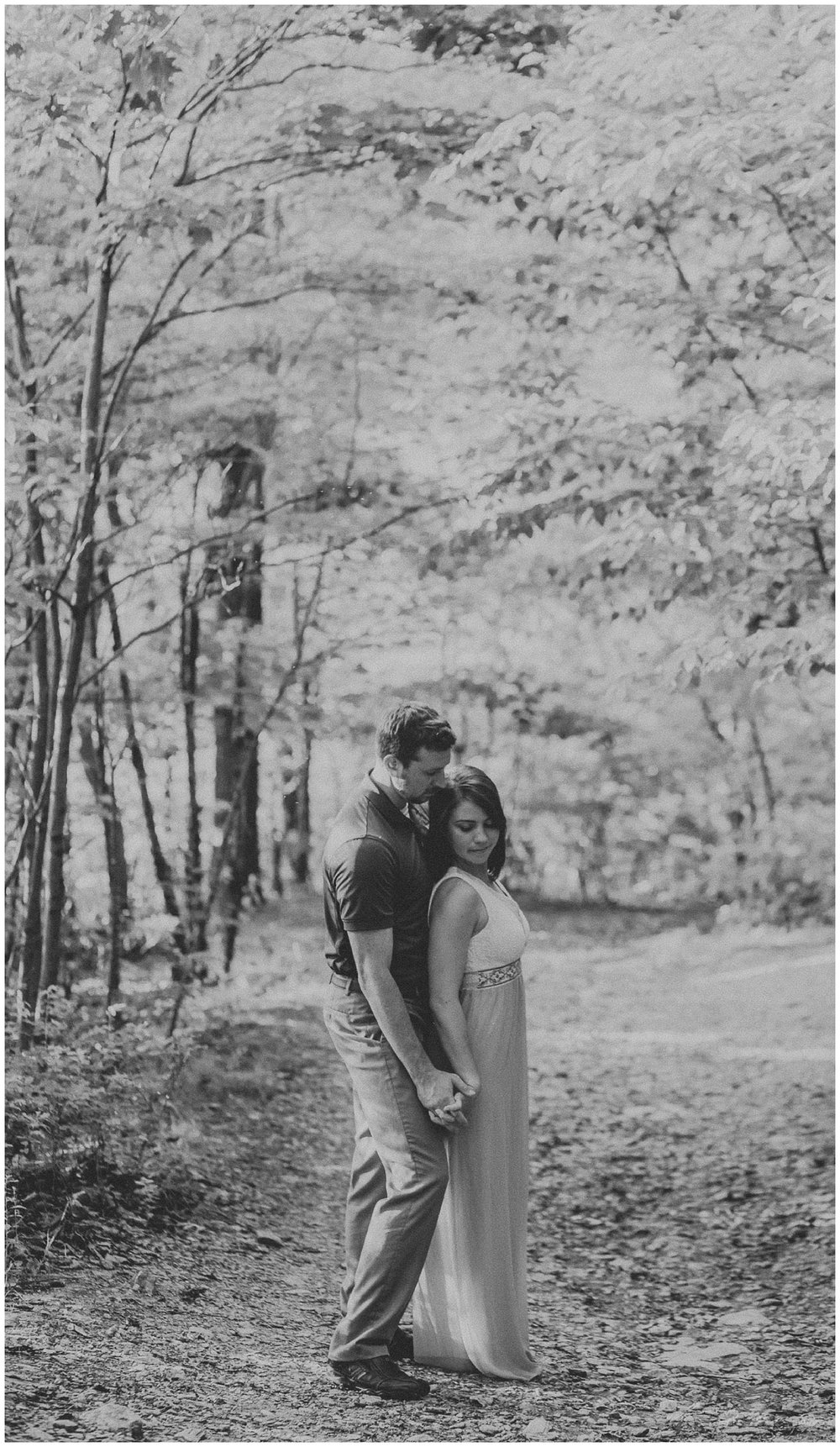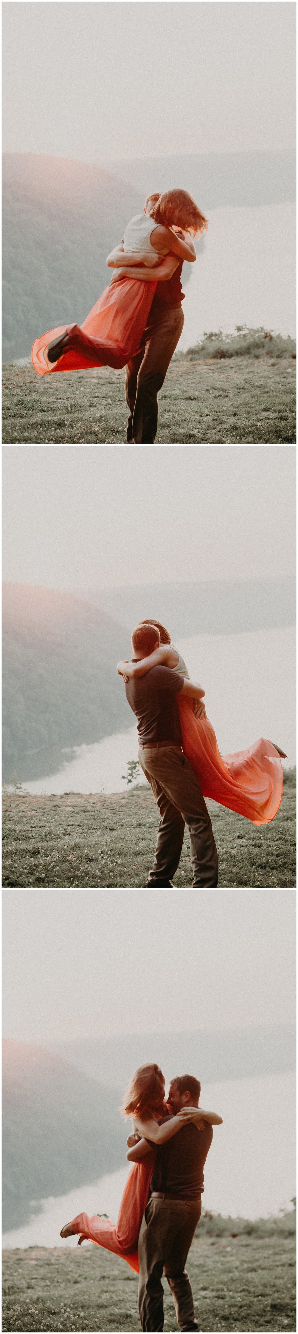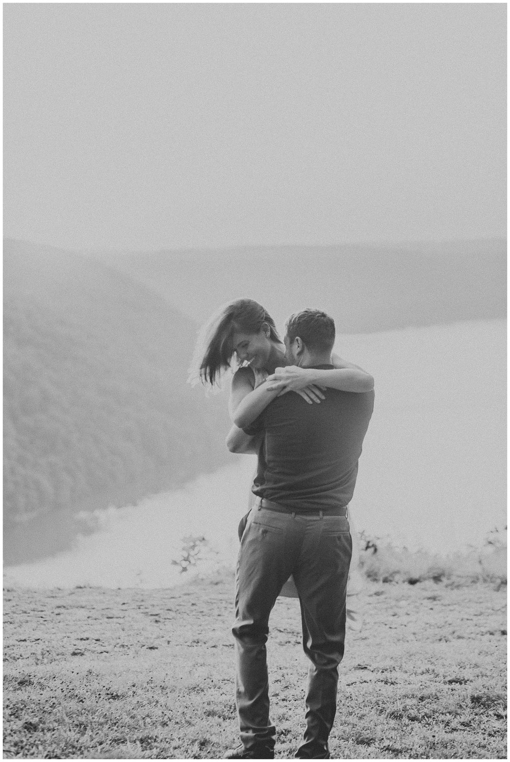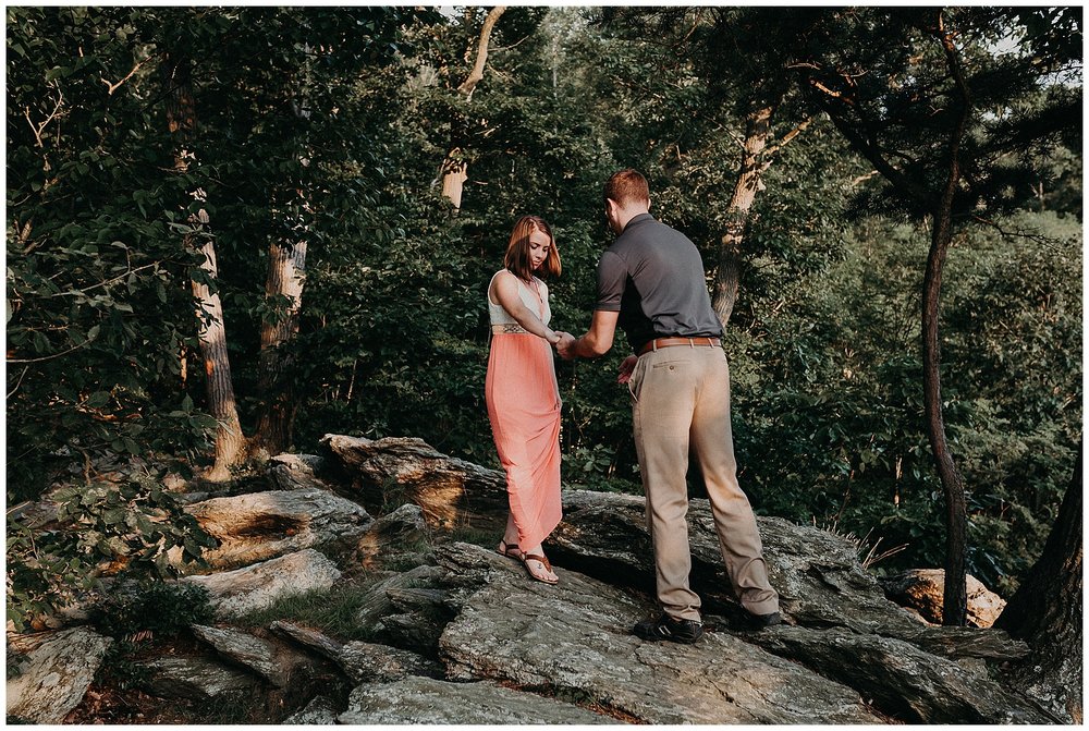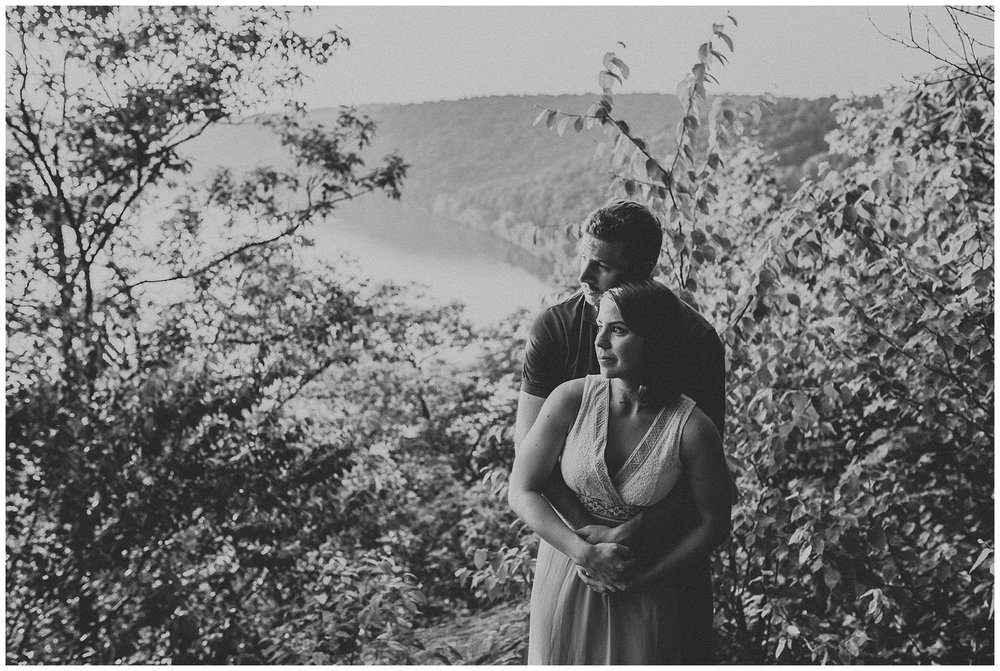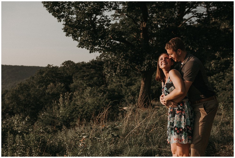 As soon as we pulled up for our session the sun was coming through the trees at just the right angle for some sun flare. *praise hands* I quickly learned that Colin is a man of few words and the way he makes Cat feel safe is through his embrace and the way he leads her and watches out for her. And I made sure to let him do plenty of that. Once we were done frolicking amongst the green we decided to explore a little further because within the first 15-20 minutes we hadn’t gotten more than a few feet from our cars. Our explorations led us over to a spot where the threes thinned and you could take in the view of the Susquehanna River. I knew there was more to Pinnacle than just that little clearing of trees so after a few more photos I asked Cat to change into her second dress. Once she was back we were ready for round two…and the big reveal.